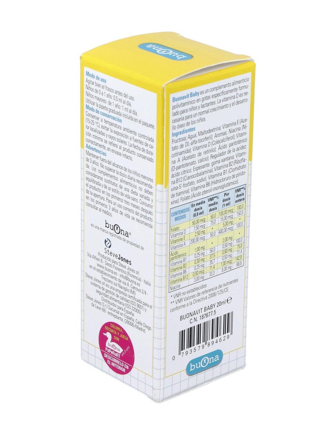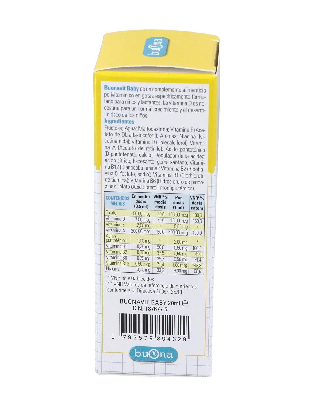 Ácido fólico: Vitaminas liposolubles: vitamina E (D,L-alfa tocoferil acetato), vitamina D (colecalciferol), vitamina A (acetato de retinilo): Ácido pantoténico: Vitaminas del grupo B: vitamina B1 (tiamina clorhidrato), vitamina B2 (riboflavina-5´-fosfato), vitamina B6 (piridoxina clorhidrato), vitamina B12 (cianocobalamina): Vitamina PP (nicotinamida).