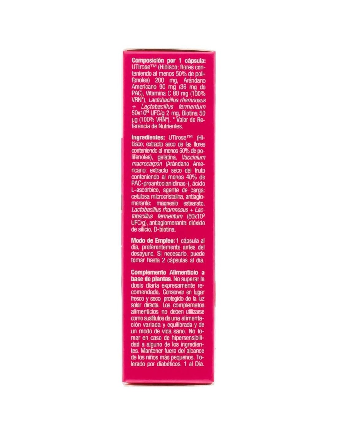 UTIroseTM (Hibiscus sabdariffa: extracto seco de las flores de hibisco conteniendo al menos 50% de polifenoles), gelatina, Vaccinium macrocarpon (Arándano Rojo: extracto seco del fruto conteniendo al menos 40% de PAC- proantocianidinas), ácido L-ascórbico, agente de carga: celulosa microcristalina, antiaglomerante: estearato de magnesio, Lactobacillus rhamnosus + Lactobacillus fermentum (50x109 UFC/g), antiaglomerante: dióxido de silicio, D-biotina.