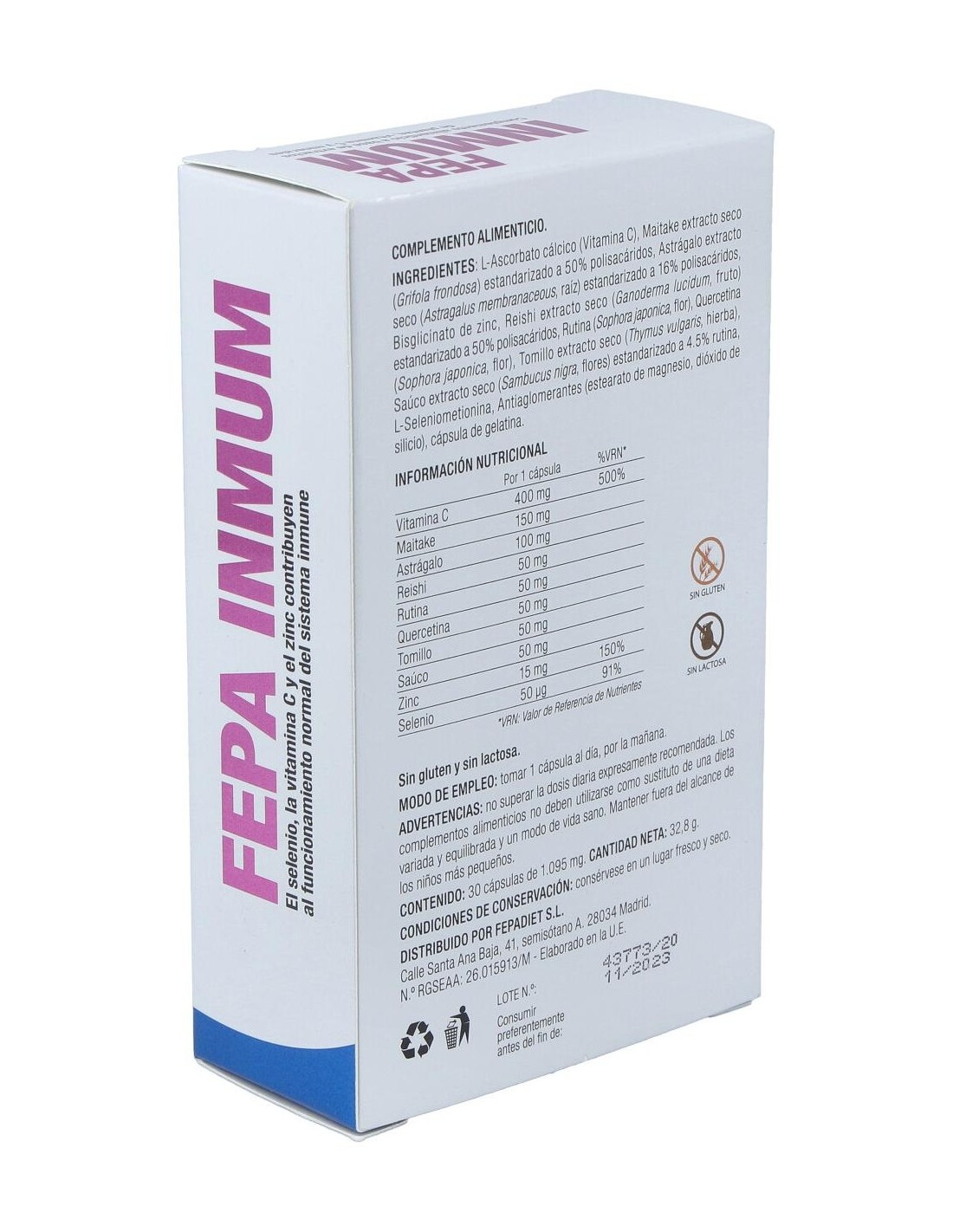 Vitamina C (ascorbato cálcico 80% vit. C) 500 mg [400 mg vit.C (500%VRN)], maitake (Grifola frondosa) fruto exto.seco 50% polisacáridos 6:1 estandarizados 150 mg, reishi frutos exto.seco 20:1 estandarizado 50% polisacáridos 50 mg, rutina (Sophorea japónica l.) flores 95% 5:1 50 mg, quercetina (Sophorae japónica) flores exto.seco estandarizado 95% 50mg, astrágalo (Astragalus membranaceus) raíz exto.seco 16% polisacáridos 5:1 estandarizado 100 mg, tomillo (thymus vulgaris) hierba exto.seco 5:1 estandarizado 50 mg, saúco (Sambucus nigra) flores exto.seco estandarizado (4,5% rutina) 50 mg, seleniometionina 5000 mcg Se/g 10 mg [50 mcg Se (91%VRN)], bisglicinato de zinc 20% Zn 75 mg [15 mg Zn (150% VRN)], esterarato de magnseio (antiglomerante) 8mg, dióxido de silicio (antiglomerante) 2 mg.