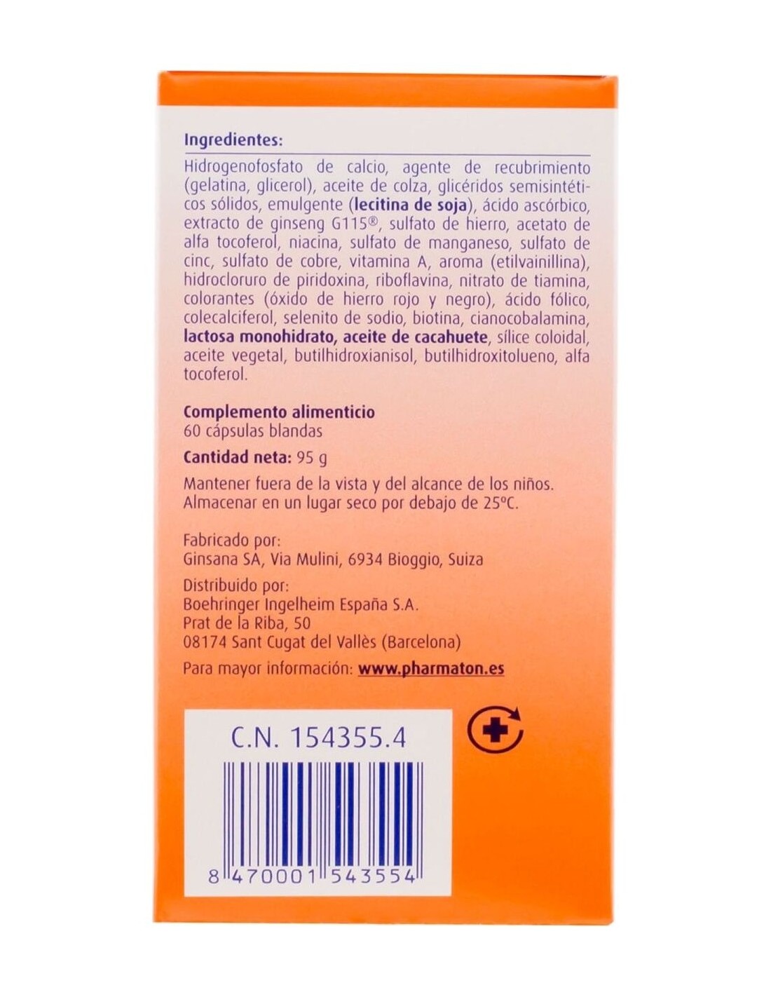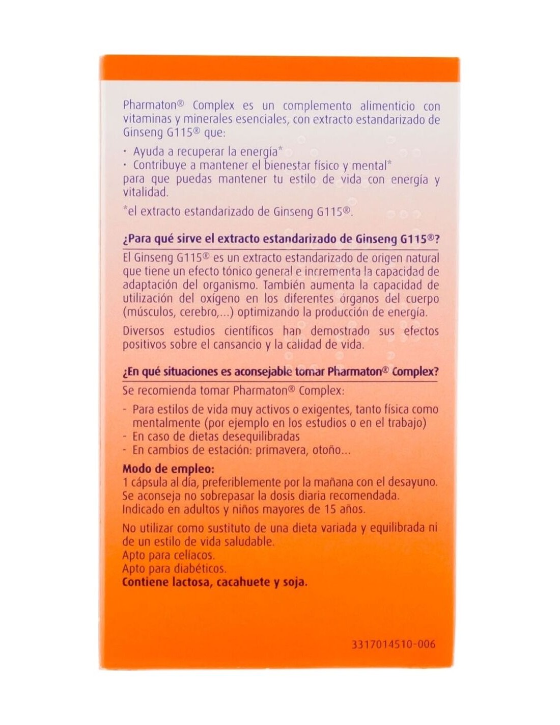 Pharmaton Complex composición: Extracto estandarizado de ginseng G115, bitartrato de dimetilaminoetanol, vitamina A, vitamina B1, vitamina B2, vitamina B6, vitamina B12, vitamina C, vitamina D, vitamina E, nicotinamida, pantotenato de calcio, rutina, calcio, cobre, hierro, flúor, fósforo, magnesio, manganeso, potasio, zinc, lecitina. Excipientes c.s.