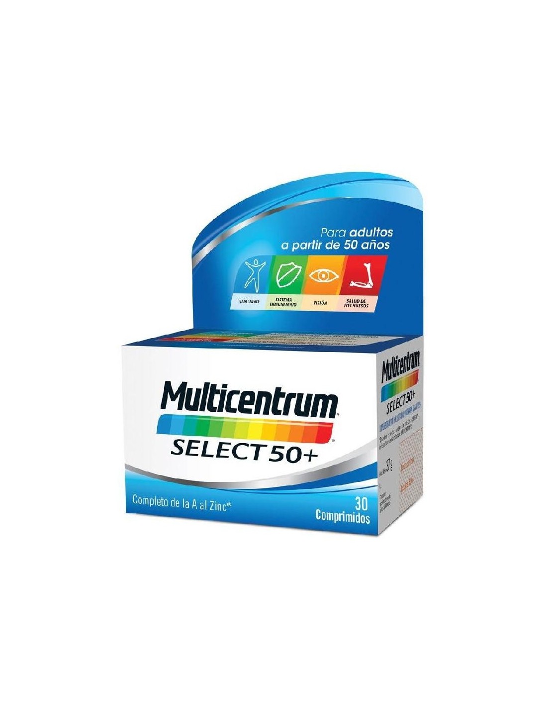 Descripción Un comprimido de Multicentrum Select 50+ al día ayuda a cubrir las necesidades diarias de vitaminas y minerales para adultos a partir de 50 años. Composición de Multicentrum Select 50+, 30 Comprimidos Contiene tiamina, riboflavina (vitamina B2), vitamina B6, vitamina B12, niacina, biotina y ácido pantoténico que contribuyen al metabolismo energético normal. Vitamina C, selenio y zinc, que contribuyen al funcionamiento normal del sistema inmunitario. Vitamina A que contribuy...