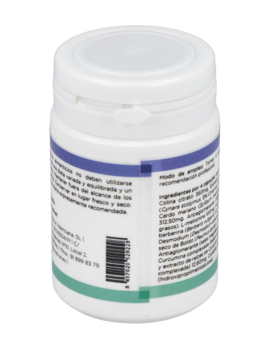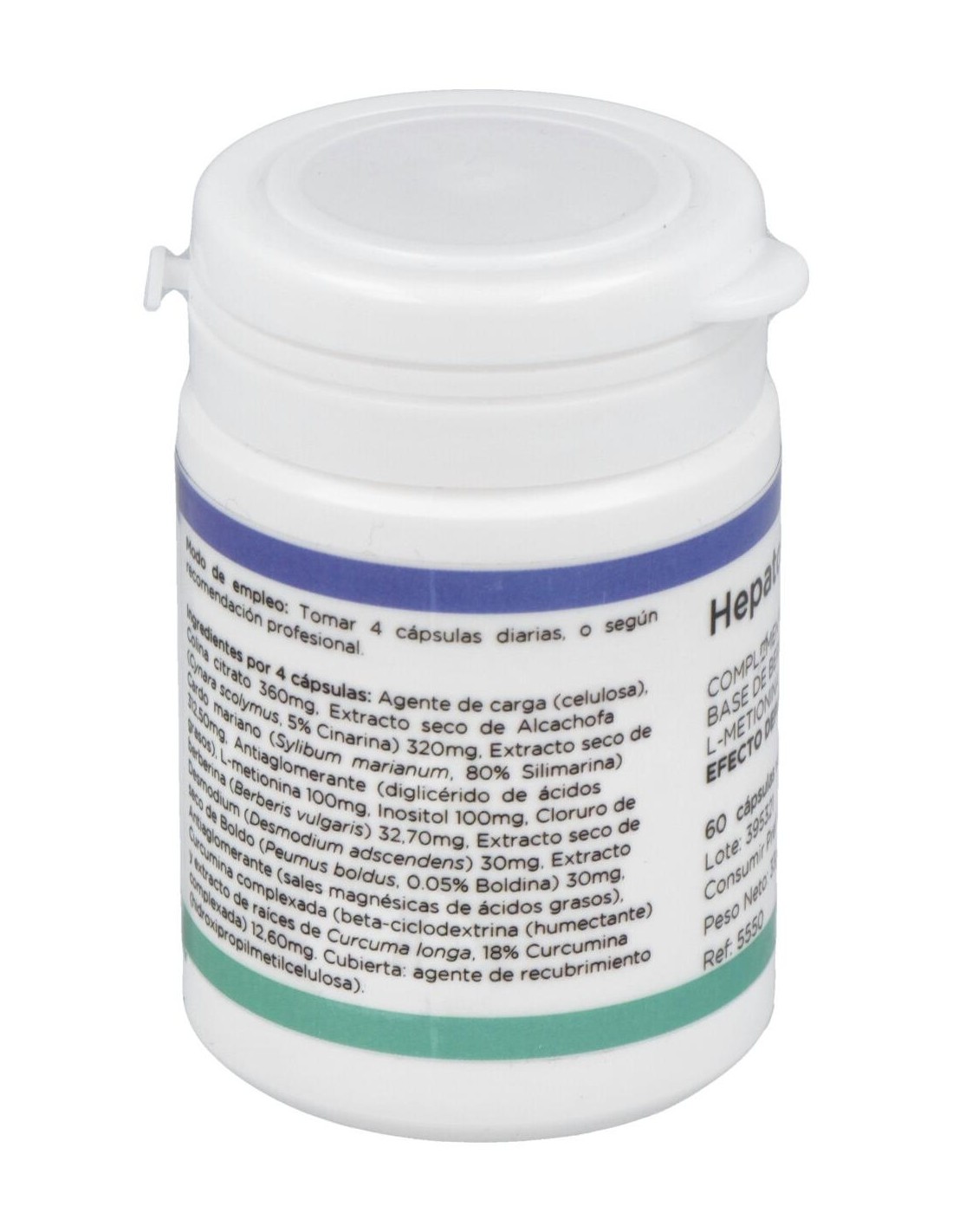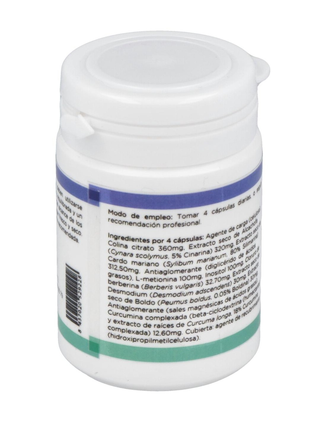 Agente de carga (celulosa), Colina citrato 360 mg, Extracto seco de Alcachofa (Cynara scolymus, 5% Cinarina) 320 mg, Extracto seco de Cardo mariano (Sylibum marianum, 80% Silimarina) 312,50 mg, Antiaglomerante (diglicérido de ácidos grasos), L-metionina 100 mg, Inositol 100 mg, Cloruro de berberina (Berberis vulgaris) 32,70 mg, Extracto seco de Desmodium (Desmodium adscendens) 30 mg, Extracto seco de Boldo (Peumus boldus, 0.05% Boldina) 30 mg, Antiaglomerante (sales magnésicas de ácidos grasos), Curcumina complexada (beta-ciclodextrina (humectante) y extracto de raíces de Curcuma longa, 18% Curcumina complexada) 12,60 mg. Cubierta: agente de recubrimiento (hidroxipropilmetilcelulosa).
