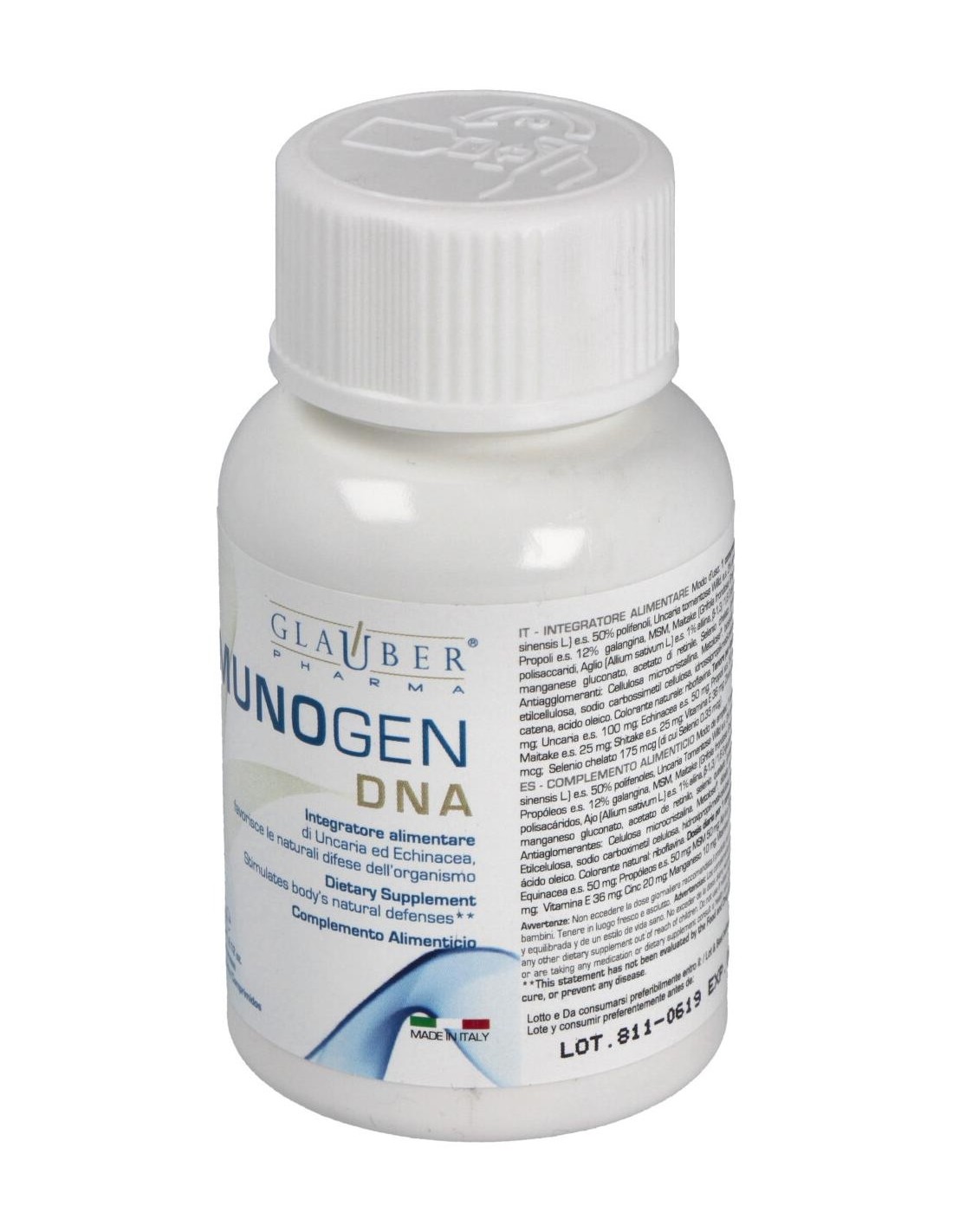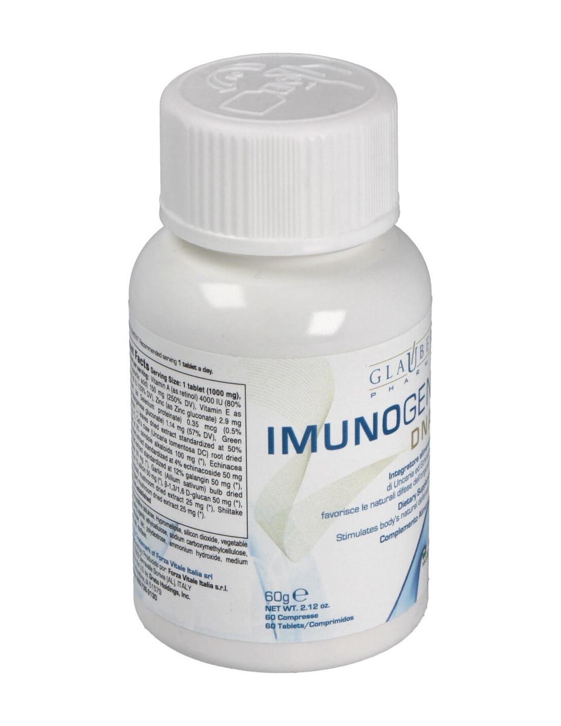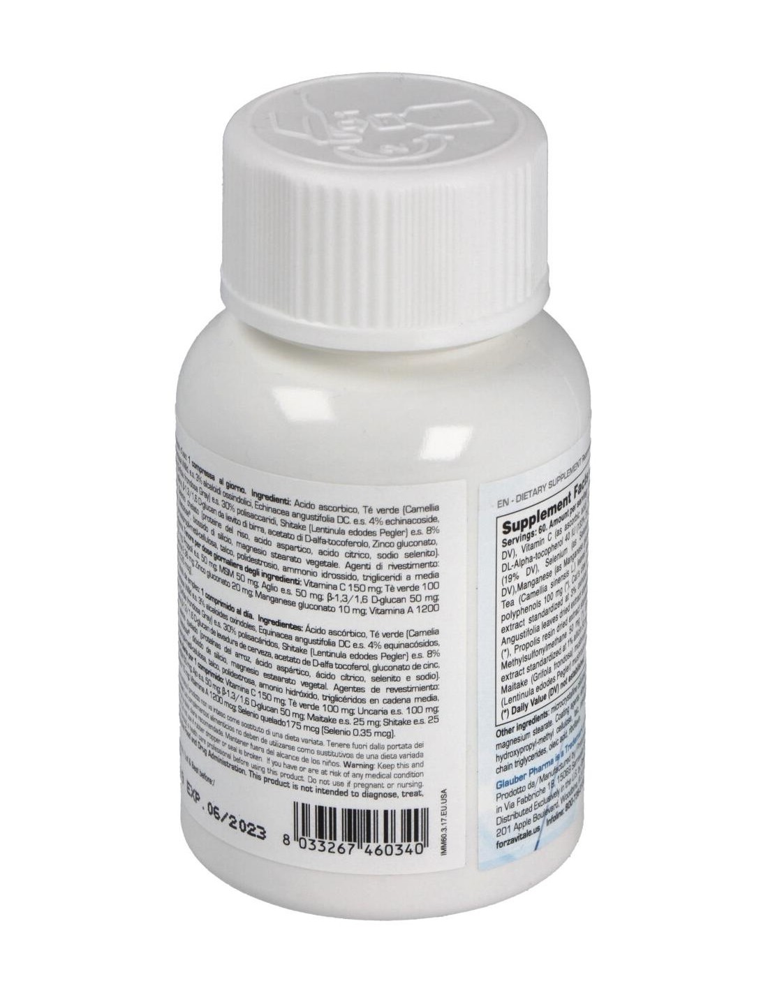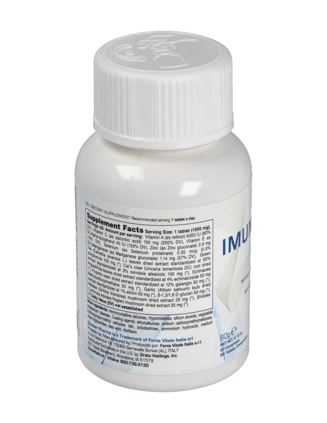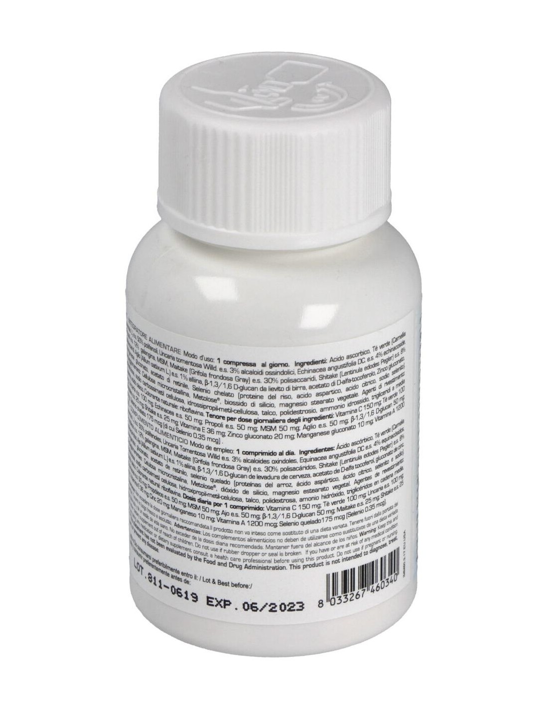 Ácido ascórbico, Té verde (Camelia sinensis L.) e.s. 50% Polifenoles, Uncaria Tomentosa Willd e.s. 3% alcaloides oxindoles, Equinácea angustifolia DC e.s. 4% equinacósidos, Propóleos e.s. 12% galangina, MSM, Maitake (Grifola frondosa Gray) e.s. 30% polisacáridos, Shitake (Lentinula edodes Pegler) e.s. 25% polisacáridos, Ajo (Allium sativum L.) e.s. 1% aliina, ß-1,3/1,6 D-glucan de levadura de cerveza, acetato de D-alfa tocoferol, gluconato de zinc, manganeso gluconato, acetato de retinilo,selenio quelado (proteínas del arroz, ácido aspártico, ácido cítrico, selenito e sodio). Antiaglomerantes: Celulosa microcristalina, Metolose, dióxido de silicio, magnesio estearato vegetal. Agentes de revestimiento: Etilcelulosa, sodio carboximetil celulosa, hidroxipropil-metil-celulosa, talco, polidextrosa, amonio hidróxido, triglicéridos en cadena media, ácido oleico. Colorante natural: riboflavina.