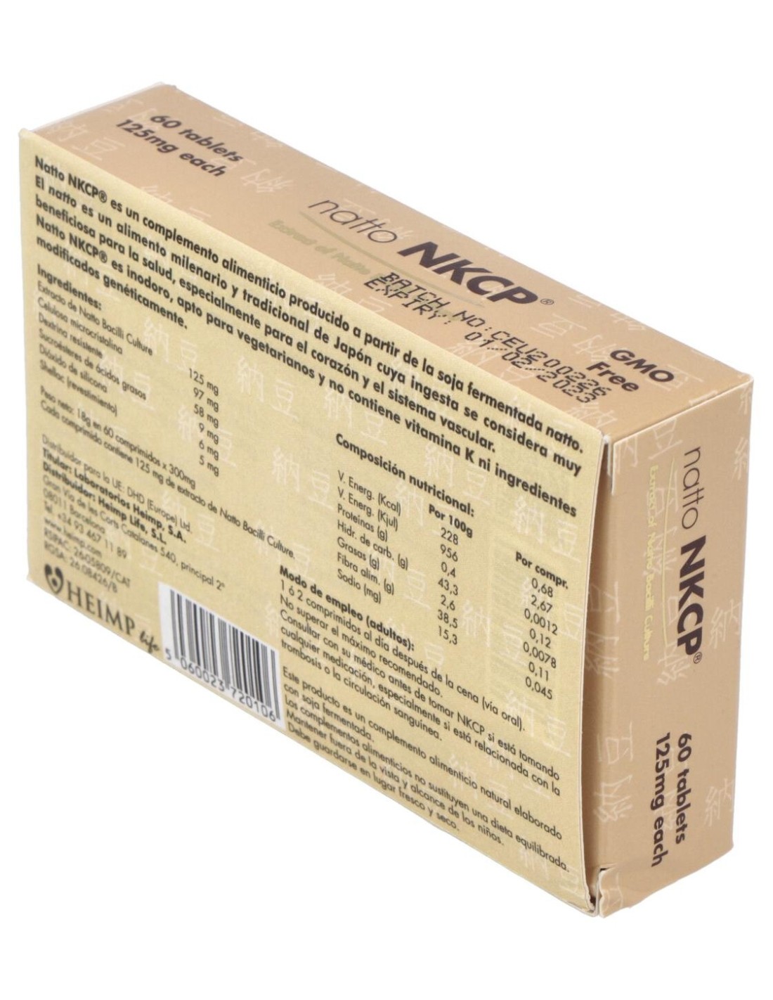 Complemento alimenticio totalmente vegetal. Comprimidos de extracto de Natto Bacilli Culture, producido a partir de la soja fermentada natto, un alimento milenario en Japón, al que se le atribuye la propiedad de ayudar al normal mantenimiento del sistema cardiovascular. Apto para vegetarianos.