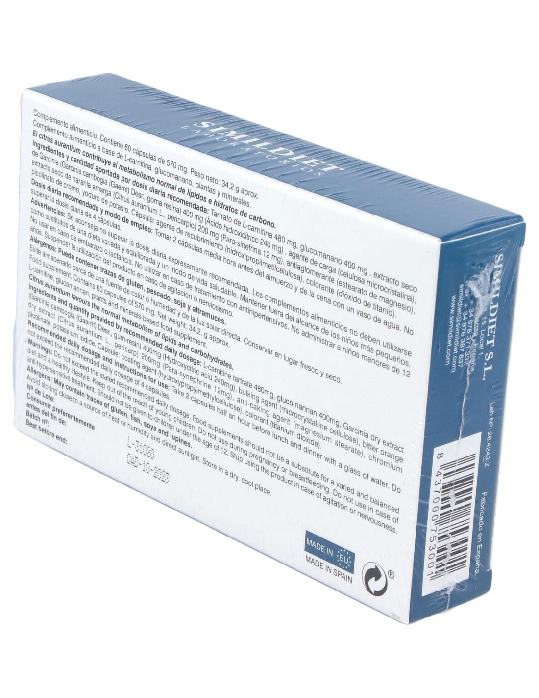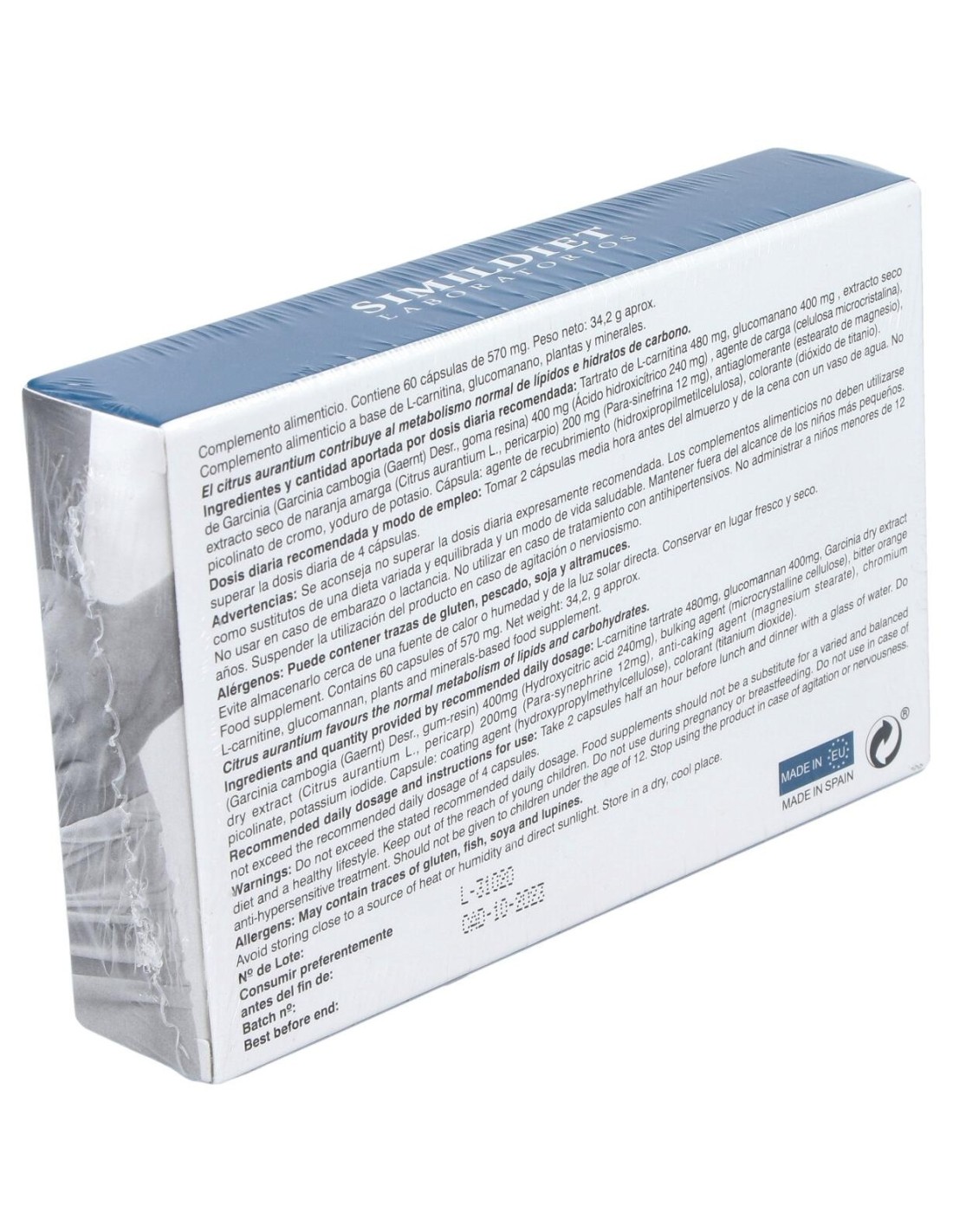 L-carnitina, glucomanano, extracto seco de garcinia cambogia, extracto seco de naranja amarga, picolinato de cromo, yoduro potásico, dióxido de titanio, estearato de magnesio, celulosa microcristalina.