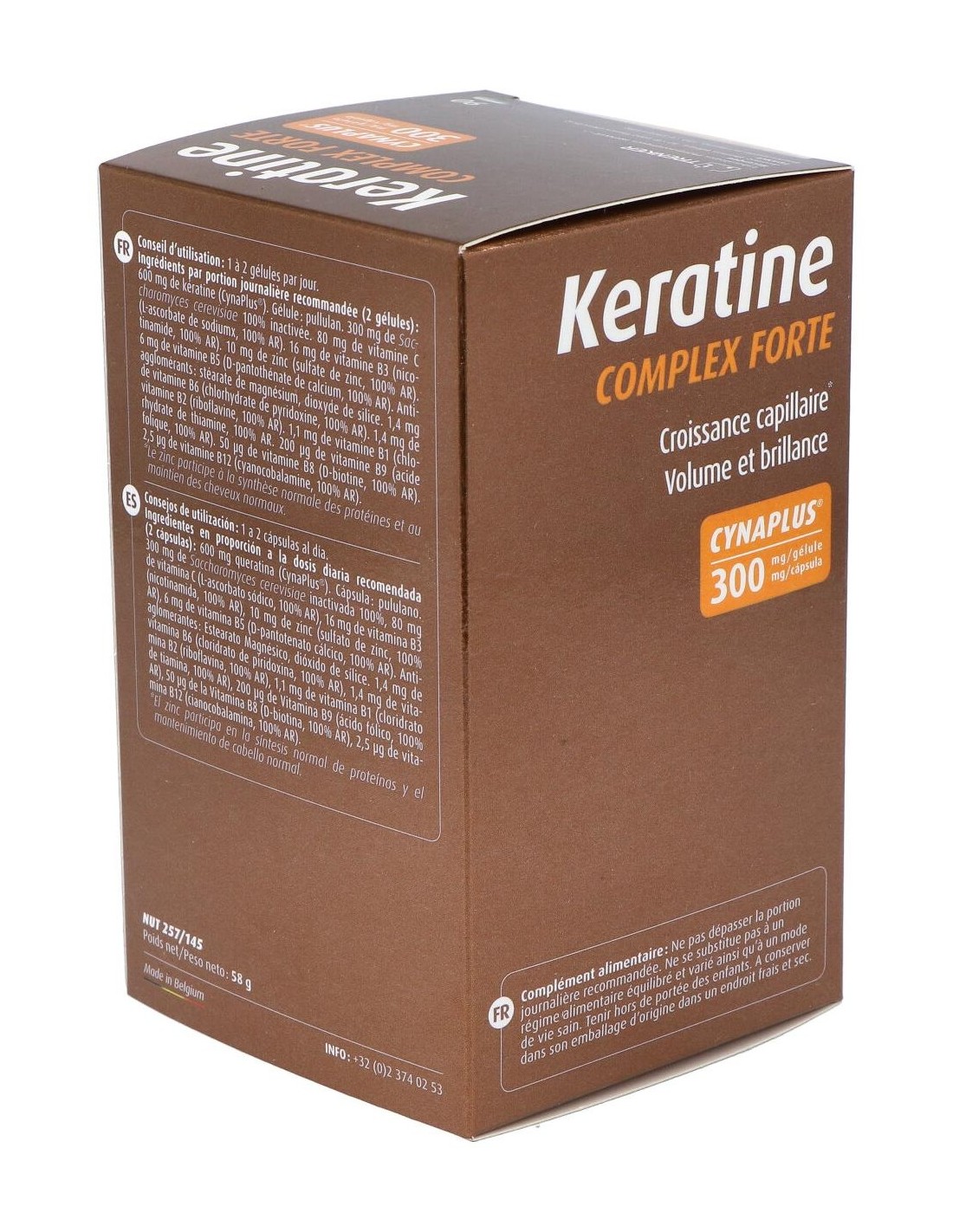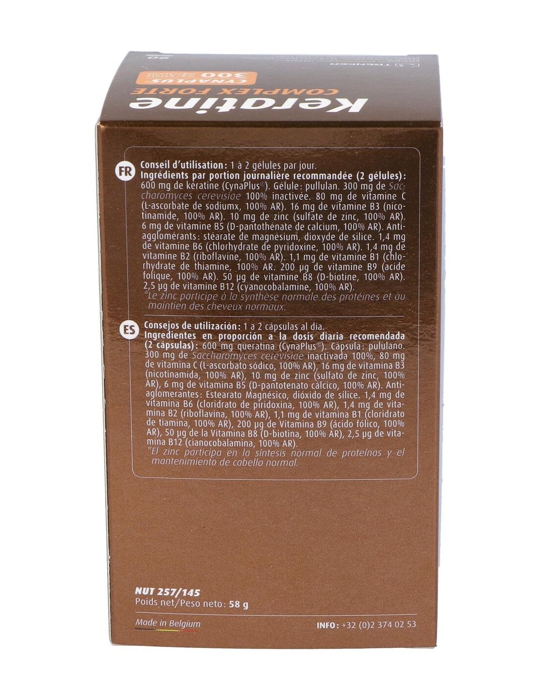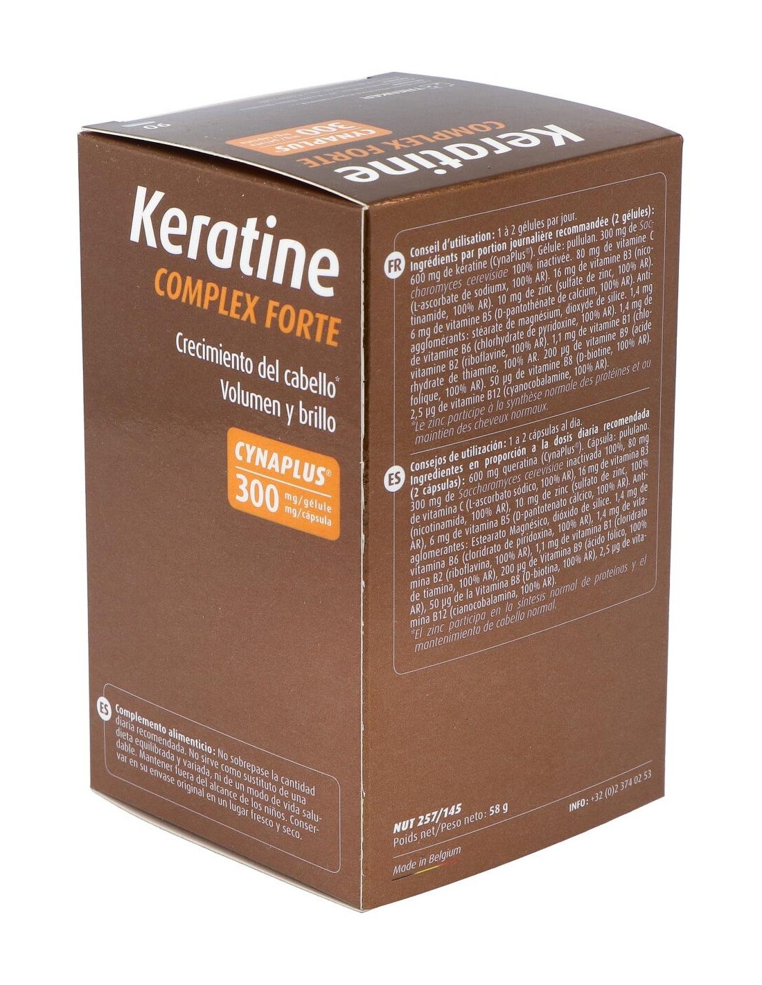 300 mg de Keratina CYNATINE HNS ® bioactiva natural y 98,5 % biodisponible - 5 mg de Gluconato de Zinc - 0,55 mg de Vitamina B1(clorhidrato de tiamina)- 0,7 mg de Vitamina B2 (riboflavina)- 8 mg de Vitamina B3 (nicotinamida) - 3 mg de Vitamina B5 (D-pantotenato calcico) - 0,7 mg de Vitamina B6 (clorhidrato de piridoxina)- 25 mcg de Vitamina B8 (D-biotina) - 100 mcg de Vitamina B9 (ácido fólico) - 2,5 mcg de Vitamina B12 (cianocobalamina)- 40 mg Vitamina C y 150 mg de Saccharomyces cerevisiae (Levadura revivificable) .