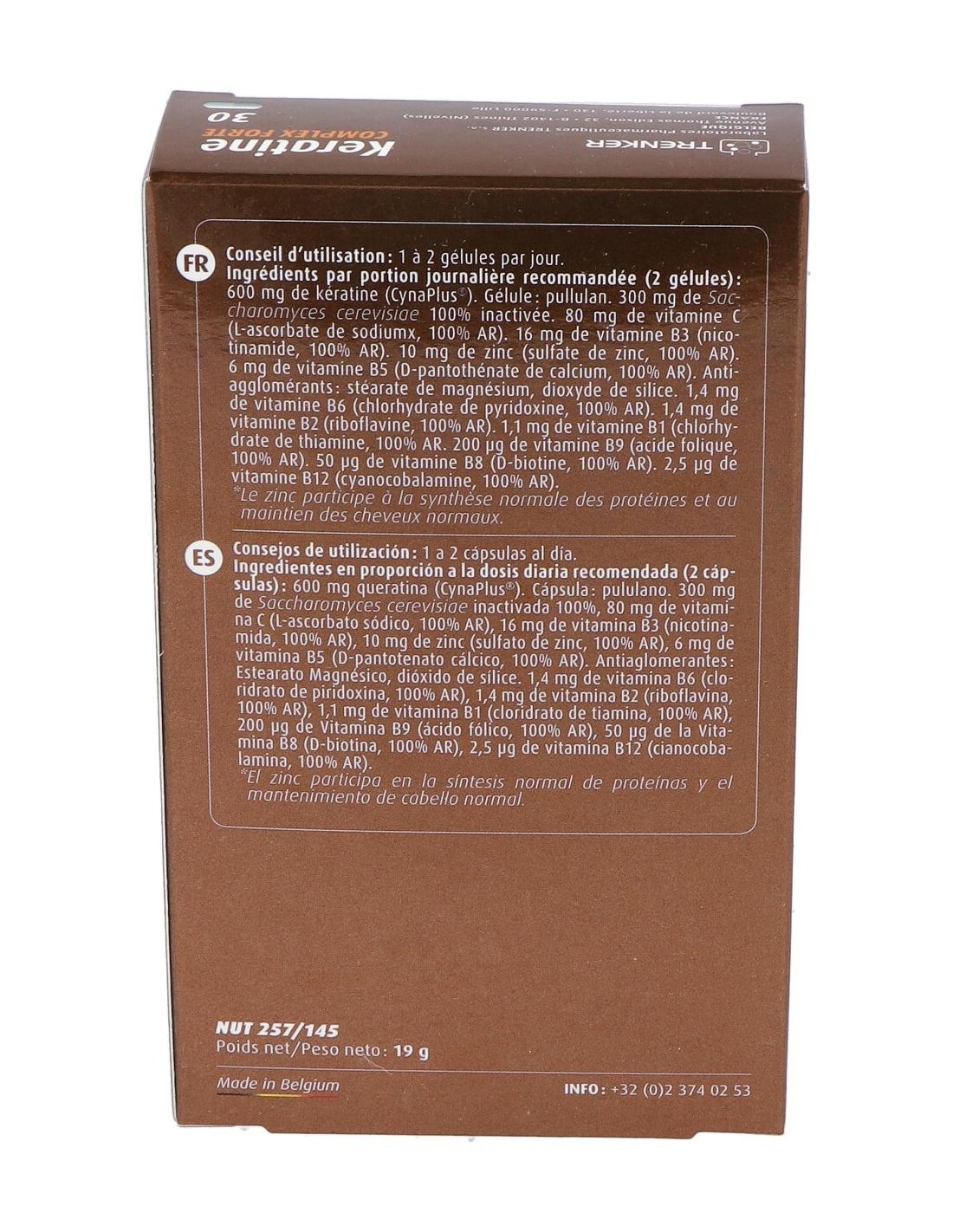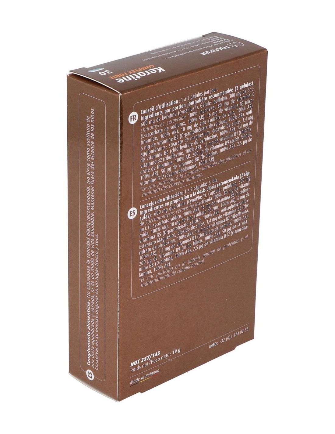 300 mg de Keratina CYNATINE HNS ® bioactiva natural y 98,5 % biodisponible - 5 mg de Gluconato de Zinc - 0,55 mg de Vitamina B1(clorhidrato de tiamina)- 0,7 mg de Vitamina B2 (riboflavina)- 8 mg de Vitamina B3 (nicotinamida) - 3 mg de Vitamina B5 (D-pantotenato calcico) - 0,7 mg de Vitamina B6 (clorhidrato de piridoxina)- 25 mcg de Vitamina B8 (D-biotina) - 100 mcg de Vitamina B9 (ácido fólico) - 2,5 mcg de Vitamina B12 (cianocobalamina)- 40 mg Vitamina C y 150 mg de Saccharomyces cerevisiae (Levadura revivificable) .