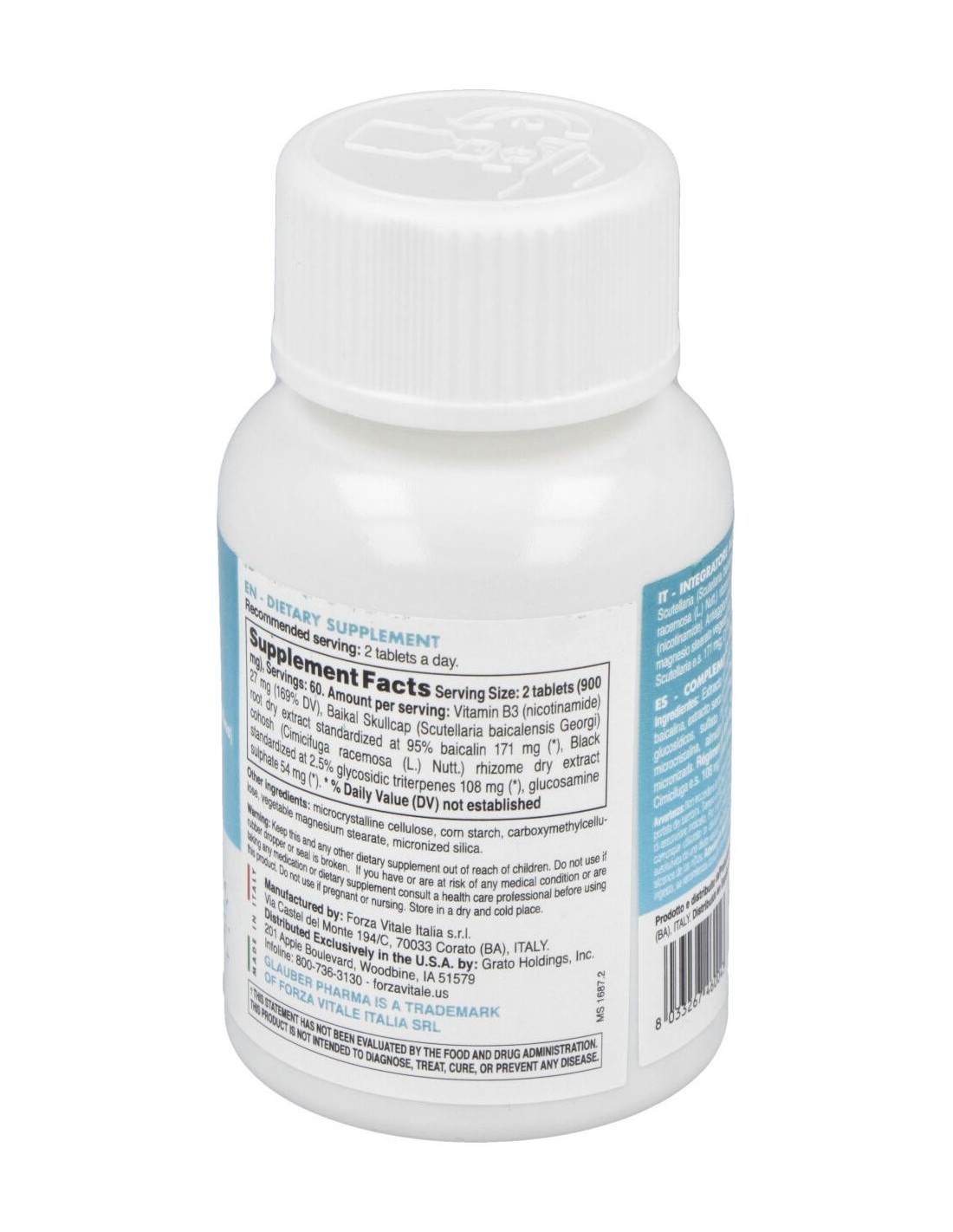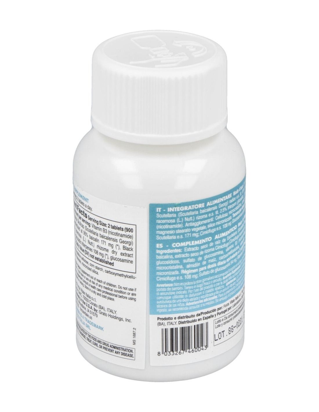 Escutelaria (Scutellaria baicalensis Georgi) raíz e.s. tit. 95% baicalina, Cimífuga (Cimicifuga racemosa (L.) Nutt.) rizoma e.s. tit. 2.5% triterpenos glicosídicos, glucosamina sulfato, Vitamina B3 (nicotinamida). Antiaglomerantes: Celulosa microcristalina, almidón de maíz, carboximetilcelulosa, magnesio estearato vegetal, sílice micronizada.