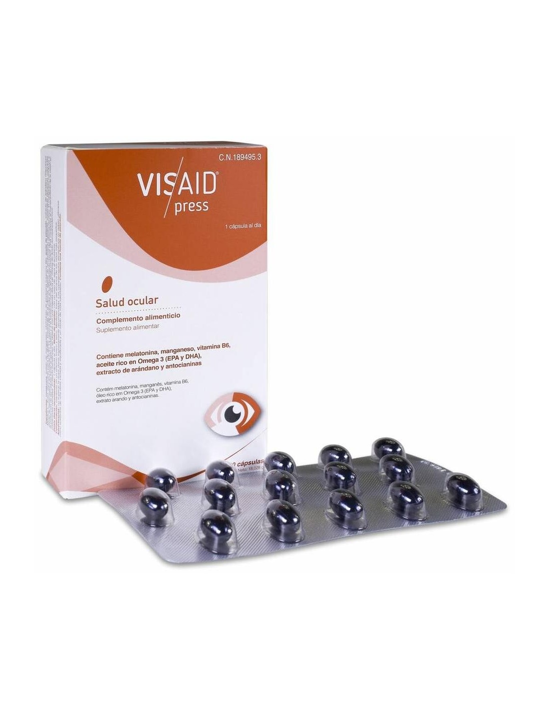 Descripción Visaid Press está compuesto a base de Melatonina, Manganeso, Vitamina B6, Omega 3, extracto de Arándano y Antocianinas. Composición de Visaid Press, 30 Cápsulas Melatonina, Sulfato de manganeso, clorhidrato de piridoxina (Vitamina B6), Aceite de pescado, extracto de arándano (Vaccinium Myrtillus L. fruto), Espesante (Cera de abeja), Envolvente de la cápsula: Agente de recubrimiento (gelatina), humectante (Glicerina), Colorantes (Óxido de hierro negro y azul brillante ...