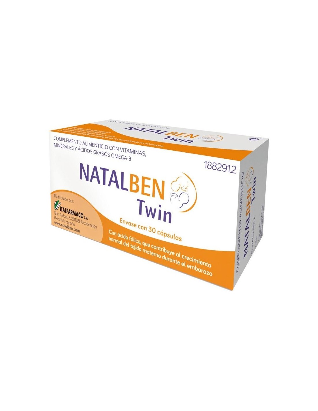 El complemento contiene aceite de pescado (DHA/EPA Omega-3), agente de recubrimiento (gelatina), fumarato ferroso, humectante (glicerina E-422), ácido L-ascórbico, humectante (sorbitol E-420), triglicéridos, nicotinamida, óxido de zinc, espesante (cera amarilla de abejas E-901), antiaglomerante (lecitina de girasol E-322), D-pantotenato cálcico, cianocobalamina, clorhidrato de piridoxina, riboflavina, mononitrato de tiamina, ácido pteroilmonoglutámico, colorante (dióxido de titanio E-171), colecalciferol, colorante (óxido de hierro negro E-172), yodato potásico, colorante (rojo carmín E-120), selenito sódico y D-biotina. Por cápsulas contiene las siguientes cantidades de vitaminas minerales y aminoácidos: Vitamina D3 (Colecalciferol): 15 mcg Vitamina C (Ácido Ascórbico): 40 mg Vitamina B1 (Tiamina): 1,1 mg Vitamina B2 (Riboflavina): 1,4 mg Vitamina B3 (Niacina): 16 mg Vitamina B6 (Piridoxina): 1,4 mg Vitamina B9 (Ácido fólico): 950 mcg Vitamina B12 (Cianocobalamina): 2,5 mcg Biotina: 50 mcg Ácido pantoténico: 6 mg Hierro: 30 mg Cinc: 10 mg Iodo: 200 mcg Selenio: 55 mcgNatalben Twin proporciona las siguientes cantidades de vitaminas minerales y aminoácidos: Proteínas: 0,166 g Hidratos de carbono,: 0,074 g Lípidos: 0,430 g/saturados: 0,057 g Omega 3 (DHA): 200 mg. Adicionalmente proporciona los siguientes valores energéticos 4,719 Kcal / 19,502 kJ.